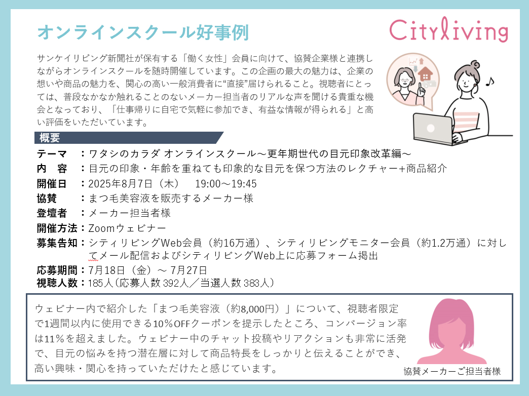 サンケイリビング新聞社では、働く女性会員に向けて協賛企業と連携したオンラインスクールを開催しています。企業の想いや商品の魅力を、関心の高い消費者に直接届けられるのが大きな特長です。視聴者からは「自宅で気軽に参加でき、普段聞けないメーカーの話が聞けて有益」と好評を得ています。