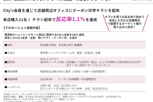【成功事例】City’s会員を通じて店舗周辺オフィスにクーポン印字チラシを配布。来店購入11名! チラシ配布で反応率1.1%を達成